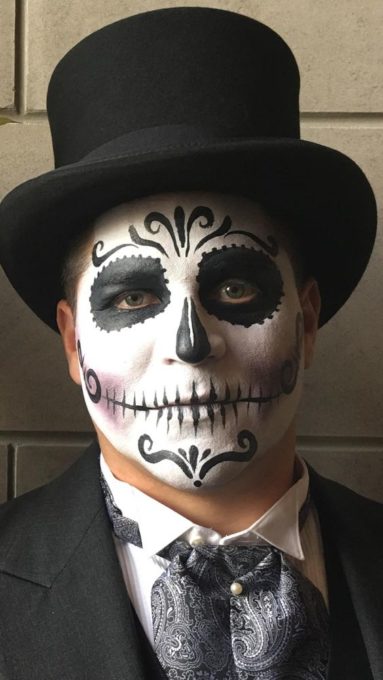 Otro de los estilos muy buenos es el maquillaje Catrina de hombre de media cara, dándote la posibilidad de ser más creativo o incluso a cada lado darle un estilo diferente.